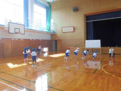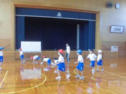 先頭の人の動きを真似しながら動く「まねっこ列車」に挑戦しています。いろいろな動きを考え、みんな楽しく表現あそびをしていました。