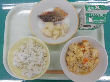 今日の給食の献立は、 ・菜めし ・ますのからあげ ・こふきいも ・親子煮 ・牛乳 です。