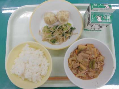 今日の給食の献立は、 ・ごはん ・ショウロンポウ ・チンゲンサイひたし ・ホイコーロー ・牛乳 です。