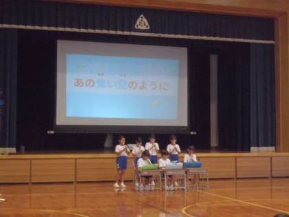 写真(中)3年生は、鍵盤ハーモニカとリコーダーでの合奏を発表しています。他にも、3年生はフラフープやダンスなども発表しました。