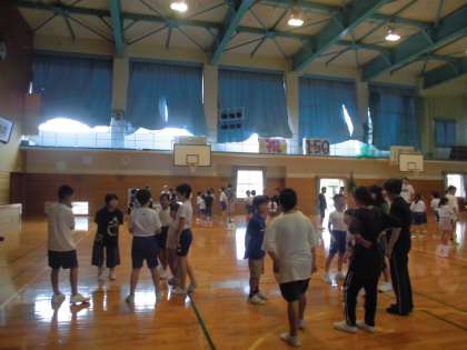 写真(下)は、縦割り班での以心伝心ゲームの様子です。