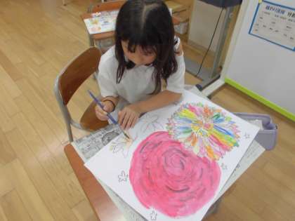 自分だけの想像の花を描いています。前回描いた線に沿って、今回は想像の花のイメージに合うように水彩で色をぬりました。4年教室には、色とりどりの花が咲いていました。