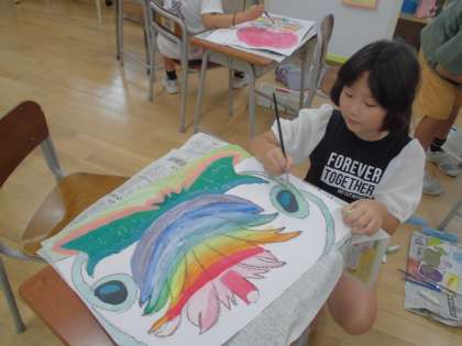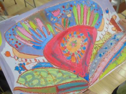 自分だけの想像の花を描いています。前回描いた線に沿って、今回は想像の花のイメージに合うように水彩で色をぬりました。4年教室には、色とりどりの花が咲いていました。