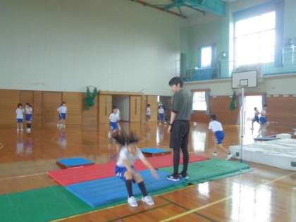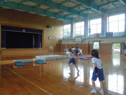 外は雨が降っていたので、今日は体育館で走り幅跳びの練習をしています。今日は、跳ぶときの腕の振り方を意識して練習しました。練習を重ねるごとに、少しずつ記録を伸ばしています。