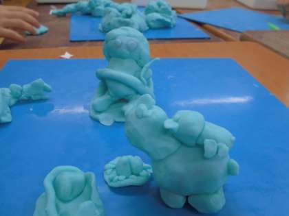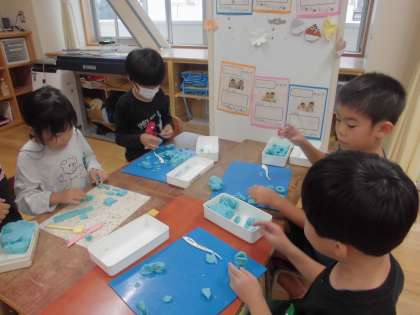 子供たちは、粘土で好きなものを作っています。クッキーやドーナツ、うさぎなど沢山の作品ができました。