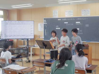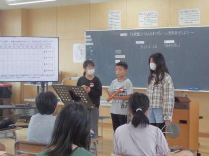 今日は、グループでリズムアンサンブルを発表しました。音の重なりや反復など、それぞれのグループの工夫がみられました。
