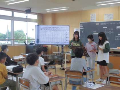 今日は、グループでリズムアンサンブルを発表しました。音の重なりや反復など、それぞれのグループの工夫がみられました。