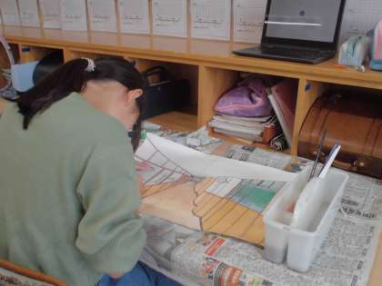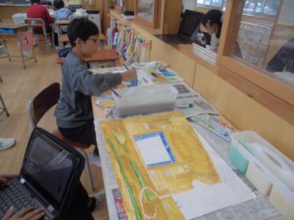 浜黒崎小学校のそれぞれの思い出の場所を描いています。今日は、以前下描きに水彩で色を塗りました。
