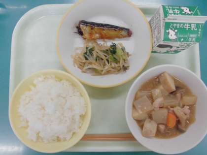 今日の給食の献立は、 ・ごはん ・いわしの生姜味 ・昆布和え ・鶏肉と里芋のごま煮 ・牛乳 です。