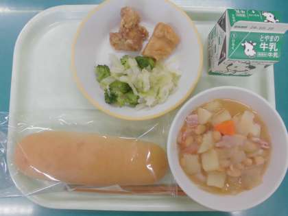 10月11日(金)今日の給食 公開日 2024/10/11 更新日 2024/10/11 給食 今日の給食の献立は、 ・コッペパン ・フライドチキン ・そえ野菜 ・豆とベーコンのスープ煮 ・牛乳 です。