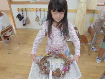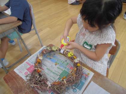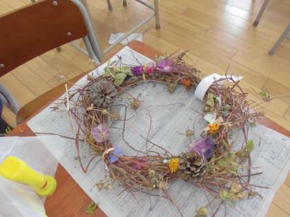 今日は、前回つくったリースに飾り付けをしました。あらかじめつくっておいた色とりどりの押し花や拾ったまつぼっくりなどをボンドでリースにくっつけて、素敵なあさがおリースが完成しました。