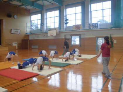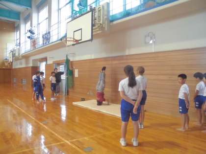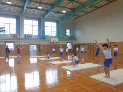 今日は講師の先生をお招きして、マット運動を指導していただきました。前転や後転、開脚前転、開脚後転、倒立の技のコツを教えていただきました。子供たちは技ができると「できた」ととてもうれしそうでした。