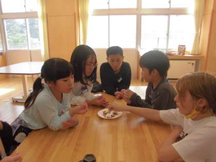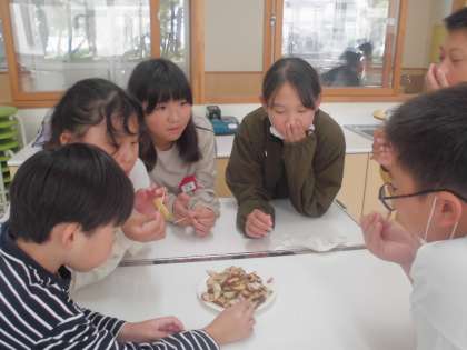 ロングわくわくタイムに、5・6年生が調理してくれたサツマイモを縦割り班ごとに食べました。試食した感想で、「おいしかった!」という声がたくさん聞こえてきました。