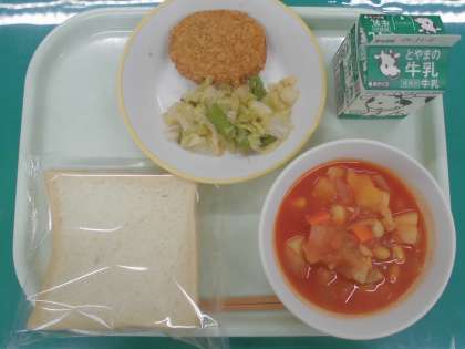 今日の給食の献立は、 ・食パン ・かぼちゃコロッケ ・アスパラサラダ ・ポークビーンズ ・牛乳 です。