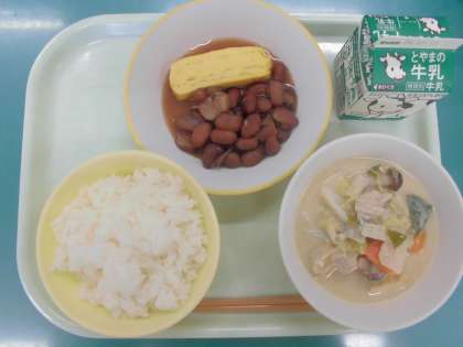 今日の給食の献立は、 ・ごはん ・厚焼きたまご ・煮豆 ・ゴマ豆乳鍋 ・牛乳 です。