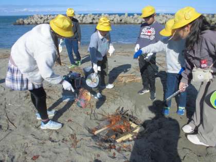 ロングわくわくタイムに、グラウンドそばの海岸に全校児童が集まり、シーサイド焼き芋が始まりました。