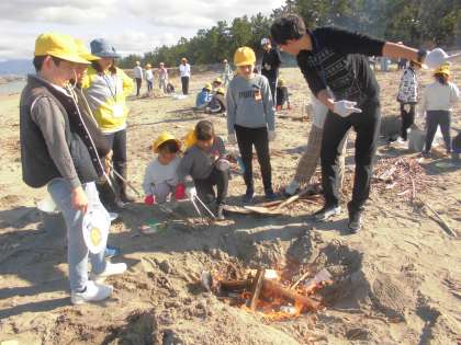 ロングわくわくタイムに、グラウンドそばの海岸に全校児童が集まり、シーサイド焼き芋が始まりました。