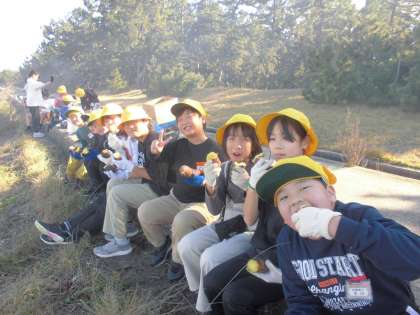 縦割り班で育て収穫したサツマイモ、それをみんなで焼いて食べる焼き芋は最高の味でした。浜黒崎海岸の景色も最高です。