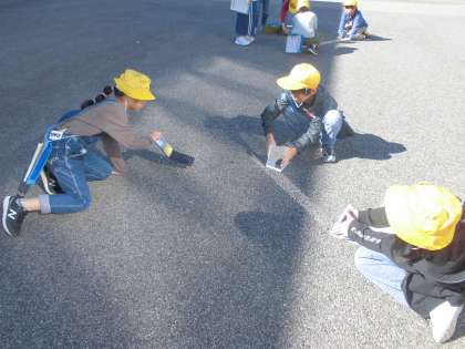 写真(上)では、日光を鏡で反射させ、光の進み方について確認しています。