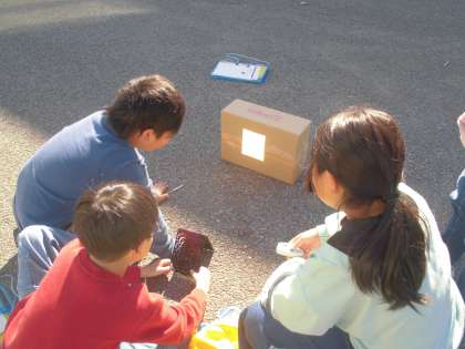 写真(下)では、鏡を使って日光を段ボールに当て、照射部位の温度や明るさの変化を調べています。鏡の枚数を1枚から2枚、3枚と増やして実験しました。