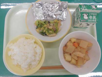 今日の給食の献立は、 ・ごはん ・さばの銀紙焼き ・しめじのごま和え ・関東だき ・牛乳 です。