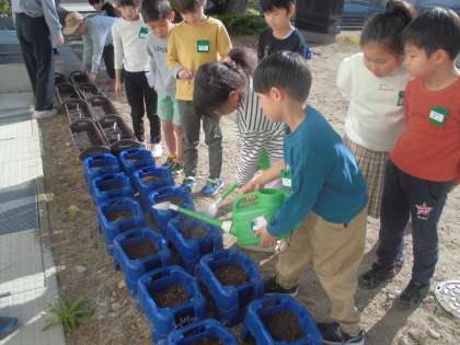 1年生は、4限目にチューリップの球根を植えました。写真は、水やりの様子です。きれいに咲くことを願って、水をたっぷりあげました。