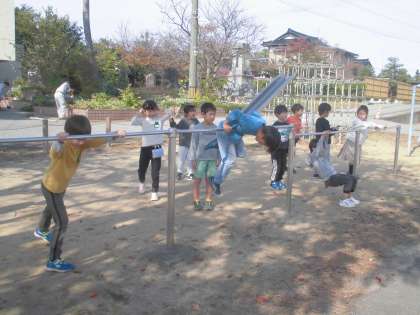 水やりの後は、前庭で鉄棒をしました。前回りやコウモリなどの技を練習しました。
