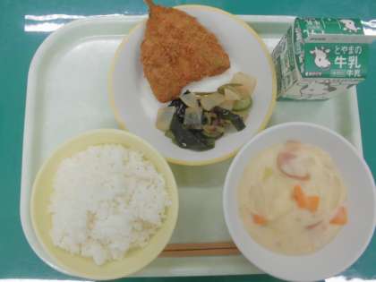 今日の給食の献立は、 ・ごはん ・あじフライ ・海藻サラダ ・クリーム煮 ・牛乳 です。