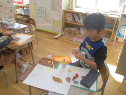 あきのあそびランドを作っています。レストランや美術館、服屋さんなど色んなお店屋さんができました。