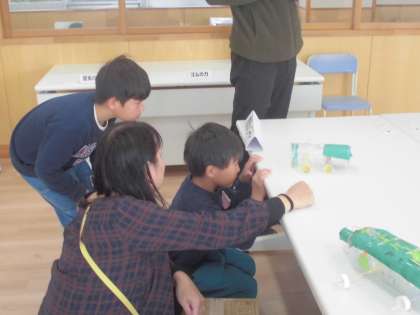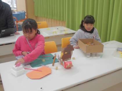 動くおもちゃづくりに取り組んでいます。子供たちは、つくったおもちゃをパワーアップさせるためにどうすればよいか話し合いました。友達とアドバイスをし合いながら、おもちゃの改良に励んでいます。