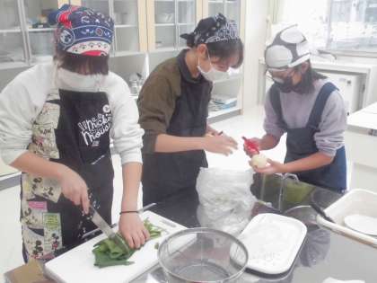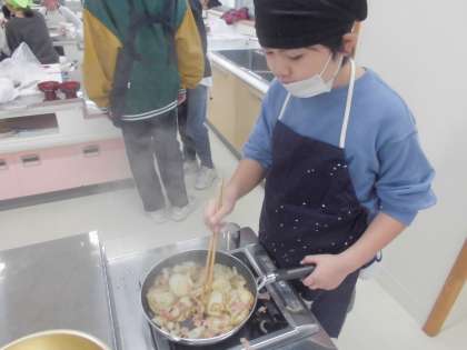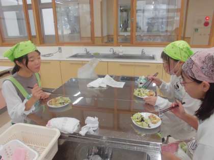 今日は、茹でる、炒めるなど今まで学習してきた調理方法を使って、グループごとに決めたメニューを作りました。グループ内で役割を分担し、協力して調理を行うことができました。