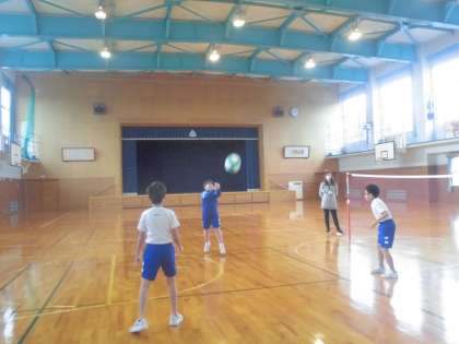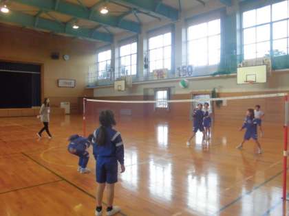 キャッチバレーボールに取り組んでいます。以前よりラリーが続くようになり、白熱したプレーも見られました。
