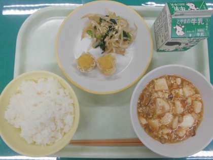 12月5日(木)今日の給食 公開日 2024/12/05 更新日 2024/12/05 給食 今日の給食の献立は、 ・ごはん ・にんじんシューマイ ・小松菜の大豆そぼろ和え ・マーボー豆腐 ・牛乳 です。