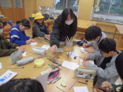 写真(上)イラスト・工作クラブは、水彩色鉛筆を使って絵を描きました。
