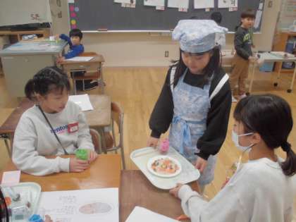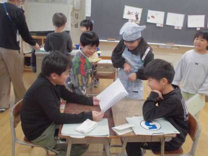11月からつくり始めた1年生の「あきのわくわく遊びランド」で、今日は5年生を招待しました。5年生は、「あきのわくわく遊びランド」を満喫して楽しんでいました。今日で全学年を招待したので店じまいです。1年生の皆さん、ありがとうございました。