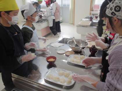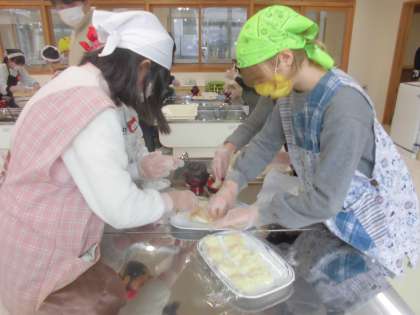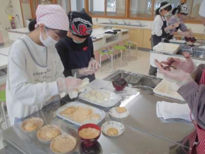写真は、お茶会の準備の様子です。おはぎを一つ一つ丁寧に丸めて、きなこやあんこをつけています。子供たちの心がこもった美味しそうなおはぎが完成しました。