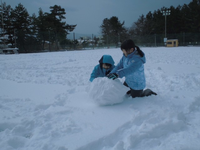 みんなで協力して、雪のベンチを作りました。最後は、ベンチに座って写真を撮りました。
