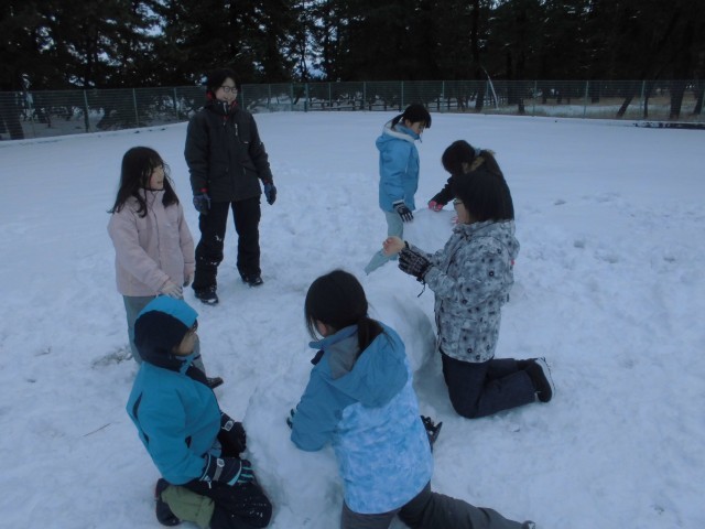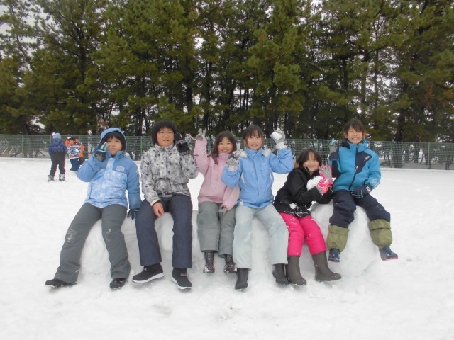 みんなで協力して、雪のベンチを作りました。最後は、ベンチに座って写真を撮りました。