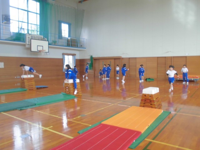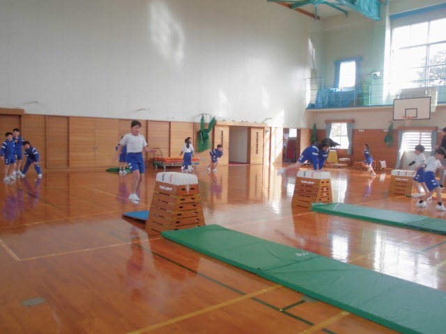 跳び箱をしています。手をつく位置や空中での姿勢を意識しながら跳んでいます。