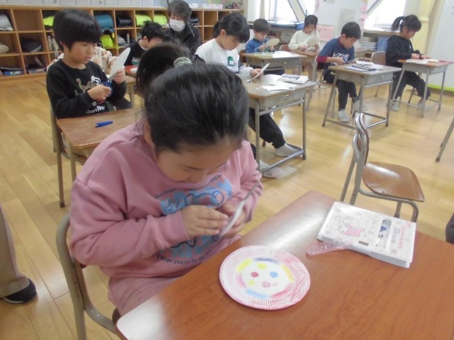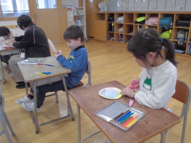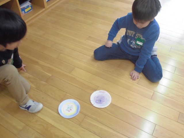 年長さんとの交流会では、紙皿を使ってコマの工作をします。