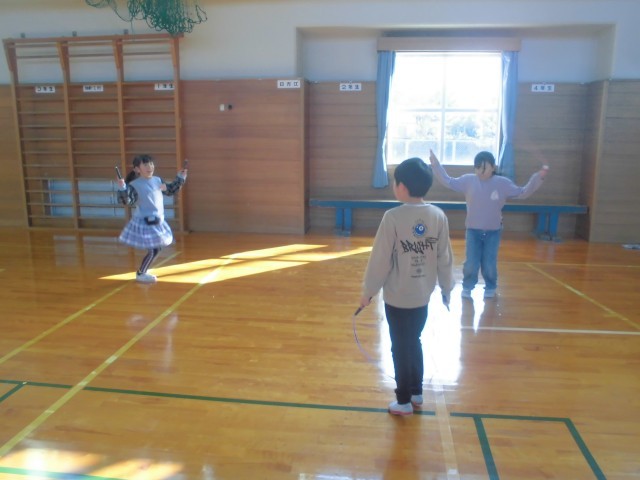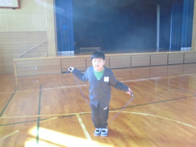 体育館で短縄跳びの練習をしています。自己ベストを更新しようと頑張っています。