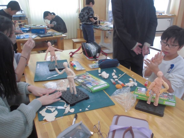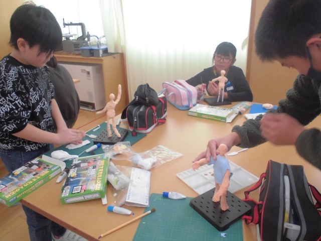 前回に引き続き、黙々と集中して取り組む子供たち。今日は、人の形ができあがり、服や髪の毛などの装飾に取りかかり始めました。