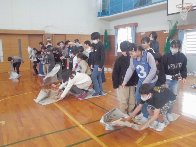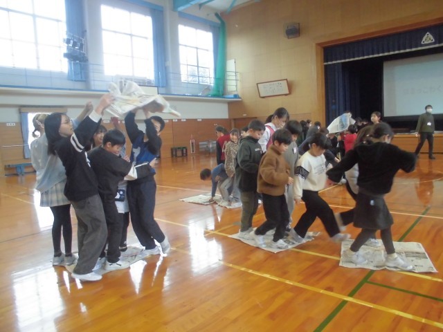 縦割り班で新聞紙に乗り移りながらゴールを目指すゲームでは、新聞紙を破かないように必死に前に進んでいました。