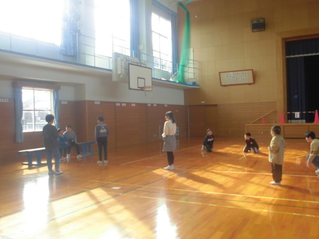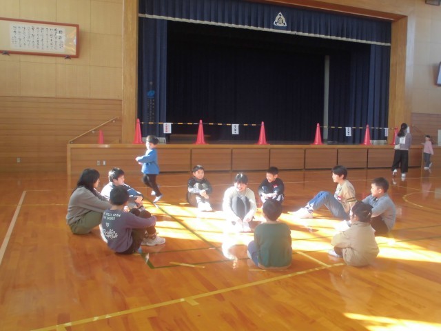 5年生は、新1年生とハンカチ落としやだるまさんが転んだをして遊び、触れ合いました。