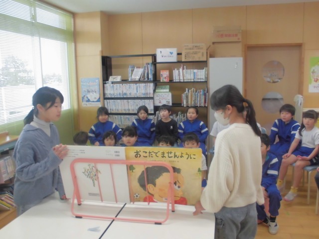 今回読み聞かせしたのは『おこだでませんように』という本でした。子供たちは、読み聞かせにじっくり耳を傾けていました。