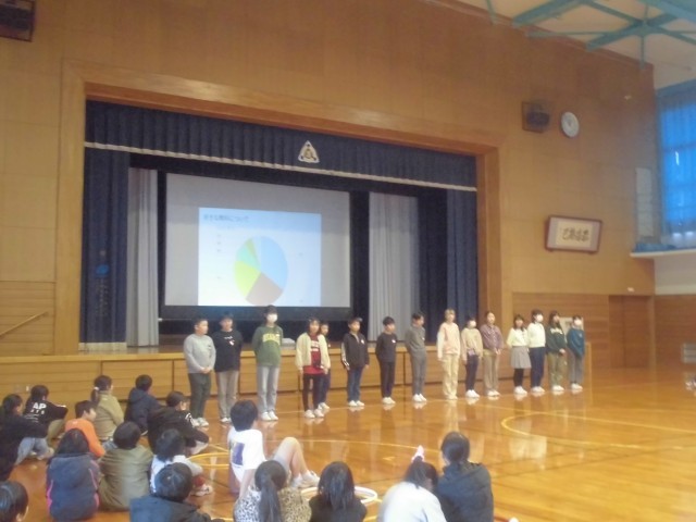 最初に、5年生が算数科の授業で取り組んだことを発表しました。好きな教科、好きなアイスクリームなどのアンケートをとり、その結果を円グラフで表しました。とても興味深い結果でした。