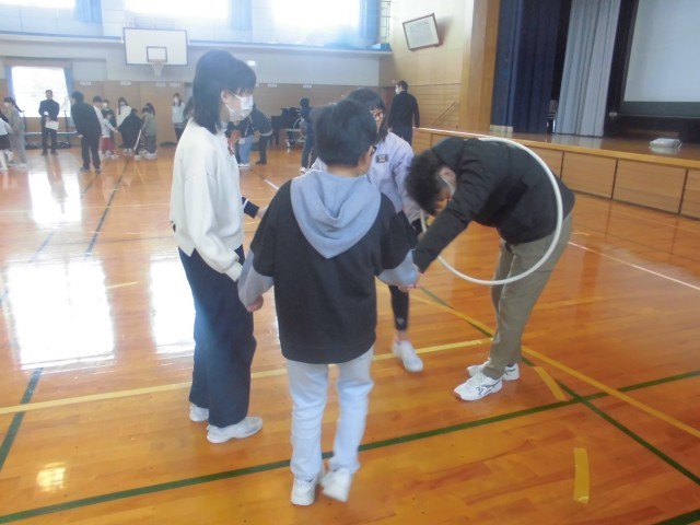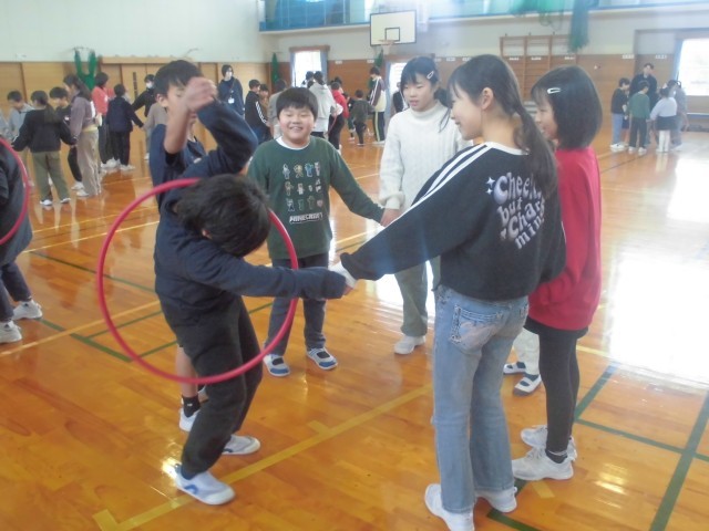 次に、縦割り班で円になり、順番にフラフープをくぐる遊びをしました。縦割り班で心を一つにして、協力しながらフラフープをくぐりました。