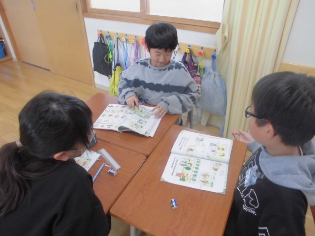 今日は、教科書に載っているある男の子の1日の様子をグループで読み合う活動をしました。「I wake up.」「I wash my face.」など、日課を表す英語表現を学ぶことができました。
