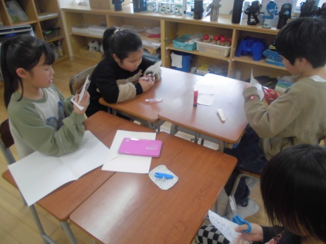 今日は、ロングわくわくタイムに1~5年生で、縦割り班の6年生に向けてメッセージカードをつくりました。今までの感謝と卒業おめでとうの気持ちを込めて、取り組みました。