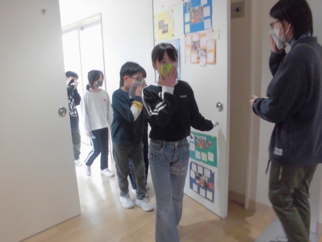 子供たちは、火災が発生したときには、防火扉やシャッターが閉まる場合があることや、通り方を担任の先生から教えてもらい、落ち着いて通り抜けていました。